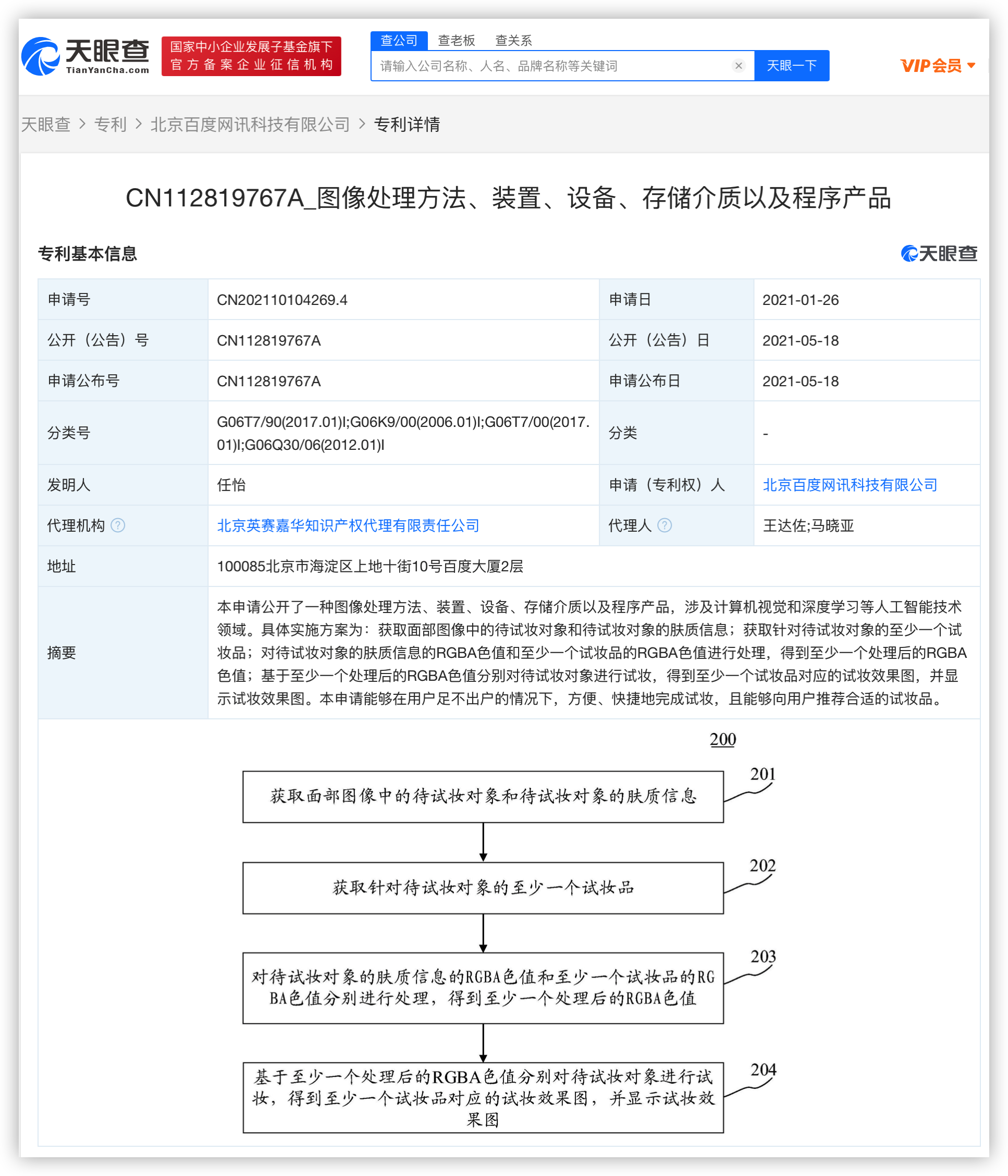 专利摘要显示,该申请涉及计算机视觉和深度学习等人工智能技术领域,通过获取面部图像中的待试妆对象、待试妆对象的肤质信息以及试妆品,进行RGBA色值处理后,得到试妆品对应的试妆效果图。可使用户足不出户的情况下,方便、快捷地完成试妆,且能够向用户推荐合适的试妆品。