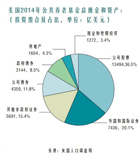 据美国人口调查局去年7月公布的数据,2014年,美国公共养老金系统持有现金和投资共计3.7万亿美元,投资品种包括:公司股票(36.5%)、外国和国际证券(20.1%)、其他非政府证券(15.4%)、公司债券(11.8%)、政府债券(8.5%)、房地产(4.3%)、现金和短期投资(3.4%)。2014年的投资收益从2013年的3,822亿美元增加到5,375亿美元。