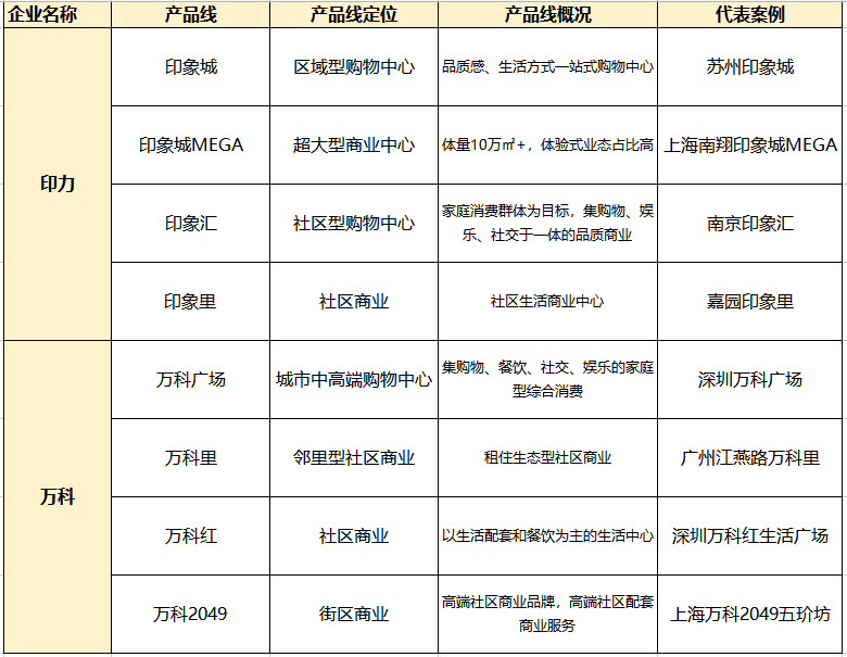 在产品方面,万科、印力各自拥有四条成熟产品线,万科主打社区商业产品,印力聚焦“印象”系列的购物中心和社区商业产品。
