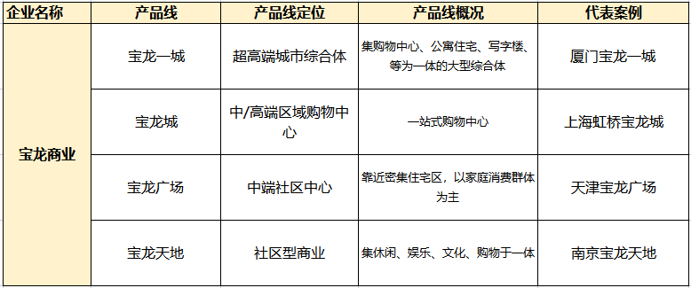 打造出超级标杆(宝龙一城)、标准项目(宝龙城)、标准mall(5万方以上的宝龙广场)及社区商业(其他)形成4条产品线。