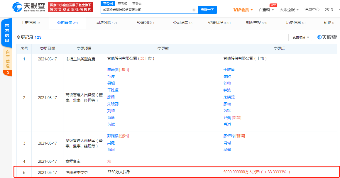 据天眼查APP显示,5月17日,成都极米科技股份有限公司发生多项工商变更,注册资本由3750万人民币增至5000万人民币,增幅约33.33%。