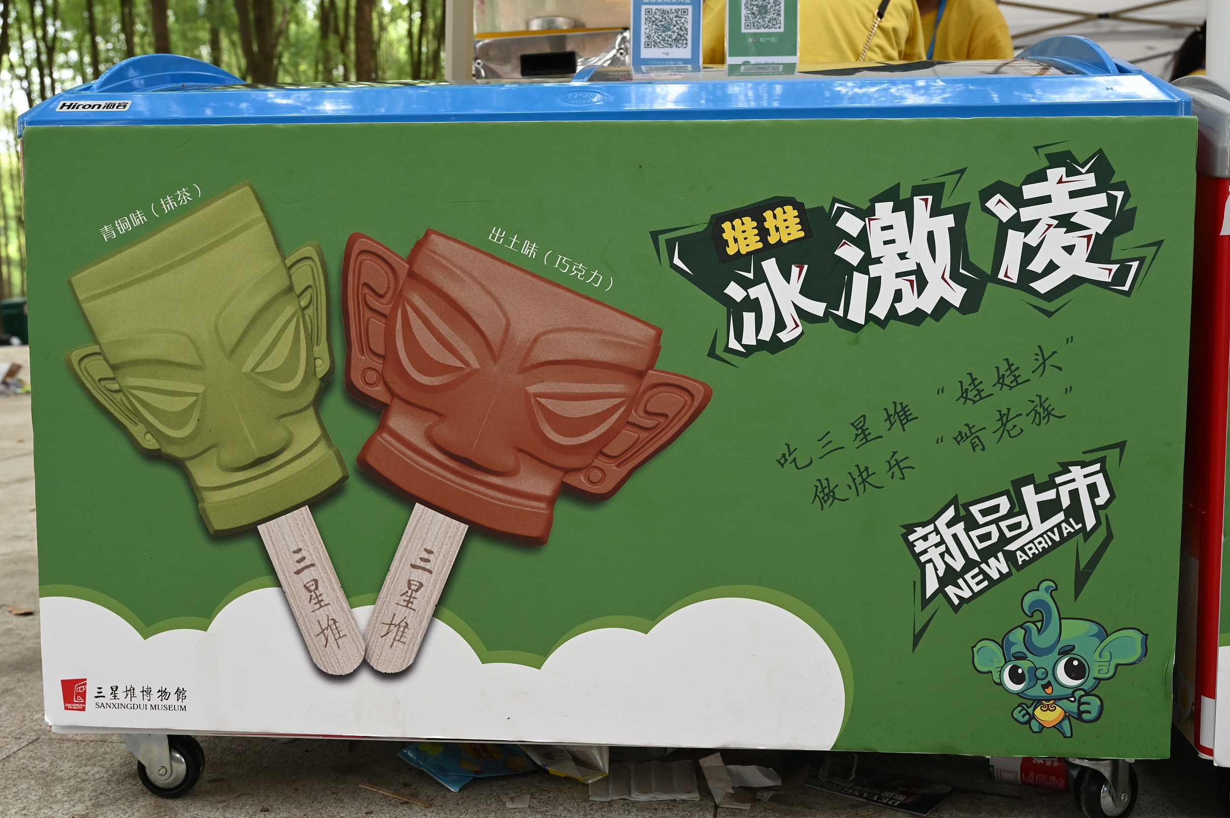 三星堆考古的余韵犹在,三星堆博物馆的“堆堆”雪糕就已在五一期间横空出世,以青铜面具为模板,包括“出土味”(巧克力)和“青铜味”(抹茶)两种口味。