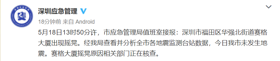 据@深圳应急管理 微博消息,5月18日13时50分许,深圳市应急管理局值班室接报:深圳市福田区华强北街道赛格大厦出现摇晃。经查看并分析全市各地震监测台站数据,今日我市未发生地震。赛格大厦摇晃原因相关部门正在核查。
