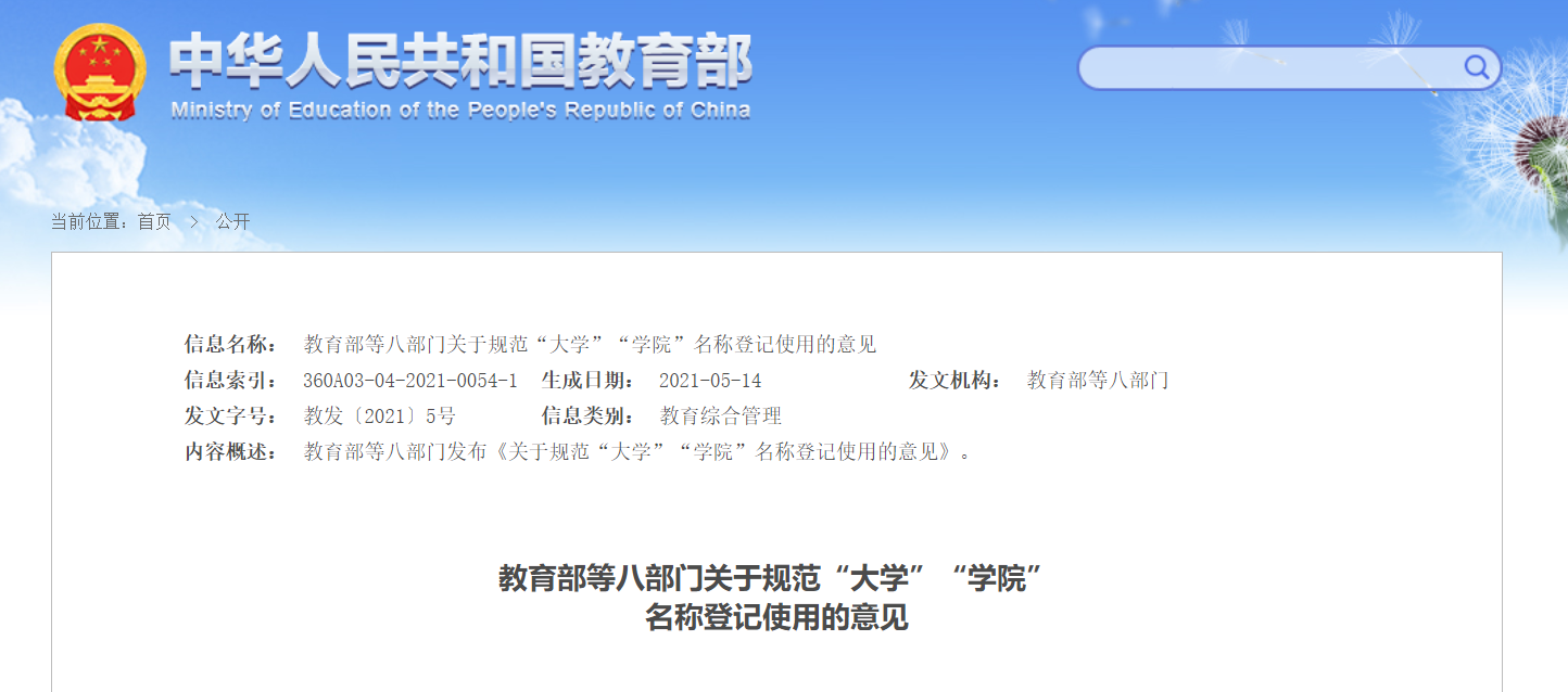 教育部网站5月18日消息,日前,教育部、中央编办、民政部、人力资源社会保障部、市场监管总局、公安部、国资委、银保监会八部门发布《关于规范“大学”“学院”名称登记使用的意见》。