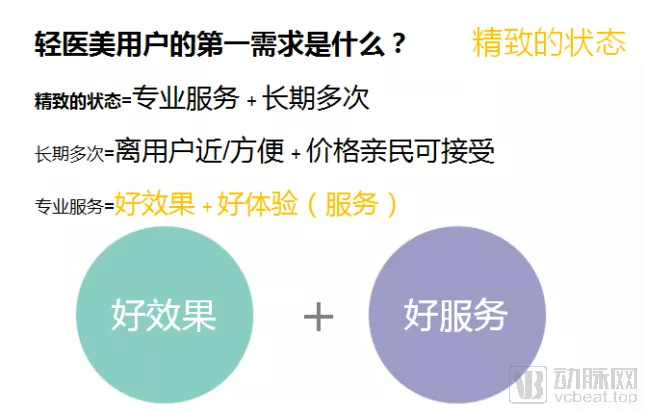 基于这样的用户需求分析,轻医美单店模型也已经逐渐清晰了,它有这几个关键词构成:离目标用户近,性价比高,效果有保障并且有一个非常舒适的服务体验。