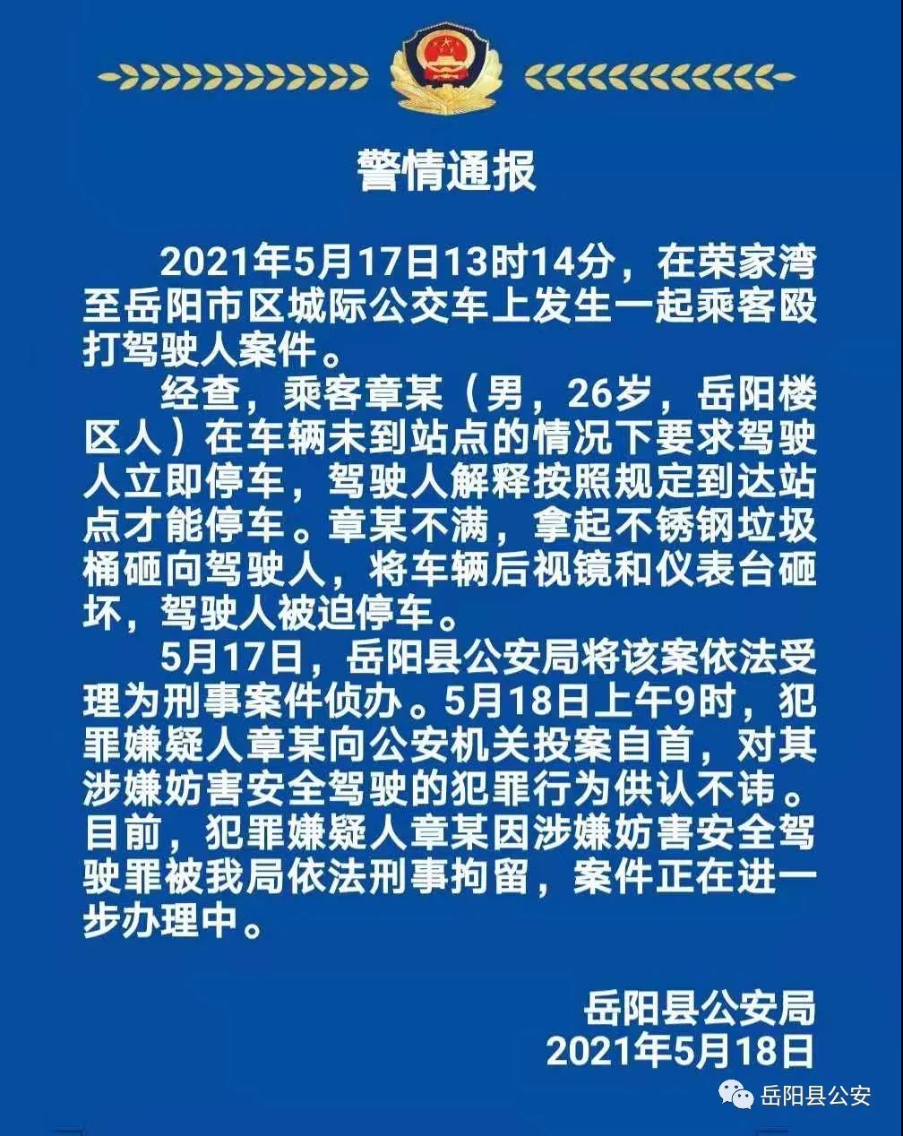 据“岳阳县公安”微信公众号消息,2021年5月17日13时14分,在荣家湾至岳阳市区城际公交车上发生一起乘客殴打驾驶人案件。