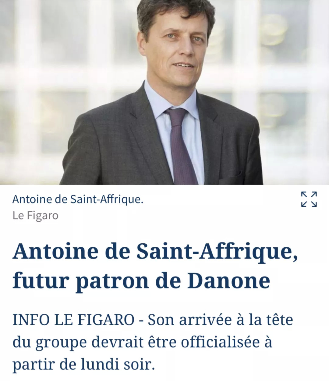 费加罗报还指出,他的个人价值观接近达能的企业文化,又评价他在快消行业的职业生涯和坚实背景将助力其成为现任达能董事长的得力辅助。报道认为,Antoinede Saint-Affrique面临重重挑战,除了继续实施“本地优先”策略,他还肩负重振达能业绩的重任,以及公司治理结构的调整。