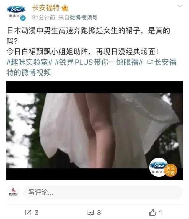 5月18日上午,长安福特官微发布视频,文案写到,“日本动漫中男生高速奔跑掀起女生的裙子,是真的吗?”并在其后附上“带你一饱眼福”等话题。