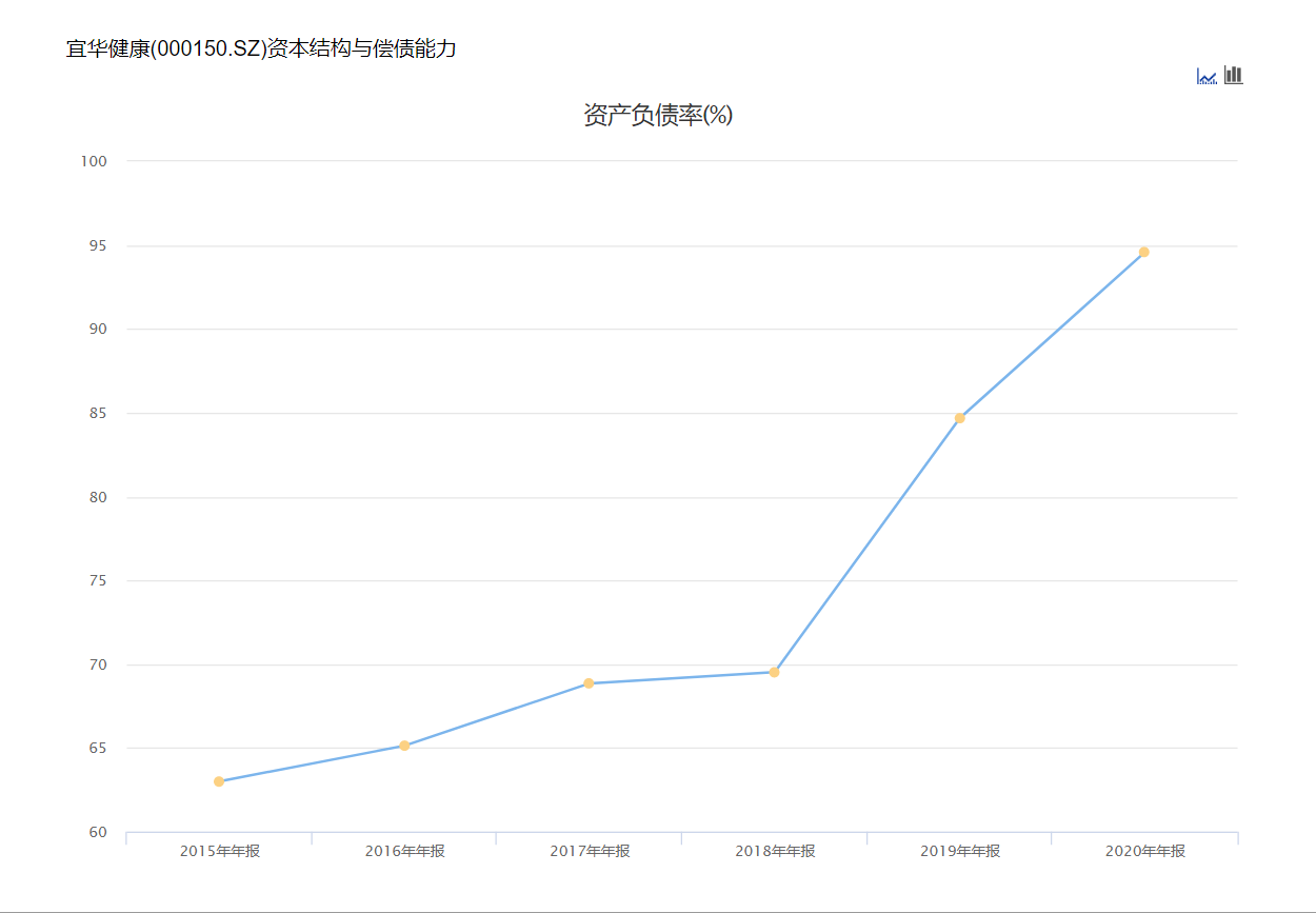 同时宜华健康资产负债率也自从2015年以来连年走高,到了2021年一季度末高达95.65%,再创历史新高。