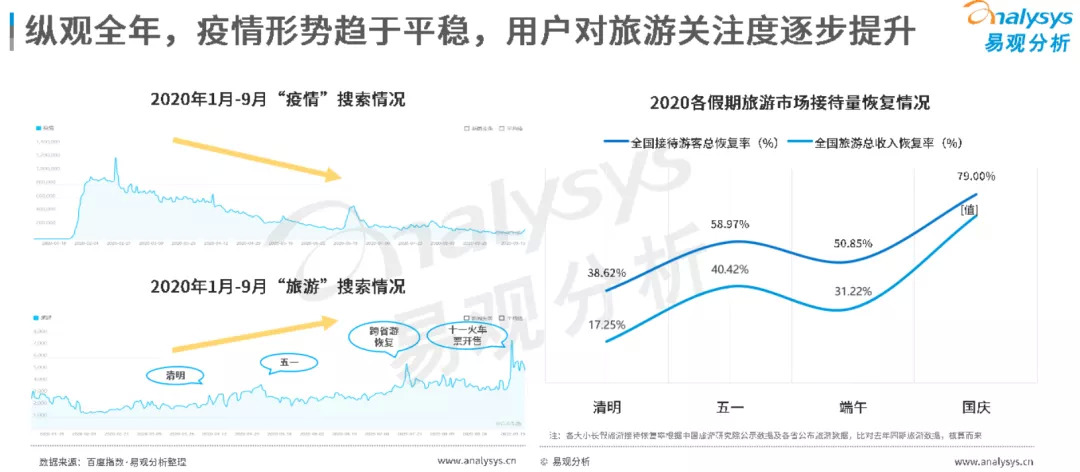 据易观千帆的数据显示,2020年各个假期旅游市场接待量正在逐步恢复,而“旅游”等关键词的搜索量也呈上升趋势,这意味着用户在疫情期间被压抑的旅游消费需求,将会被进一步释放,也成为了在线旅游平台发力的良好时机,抖音、滴滴显然不会错过这次机会。