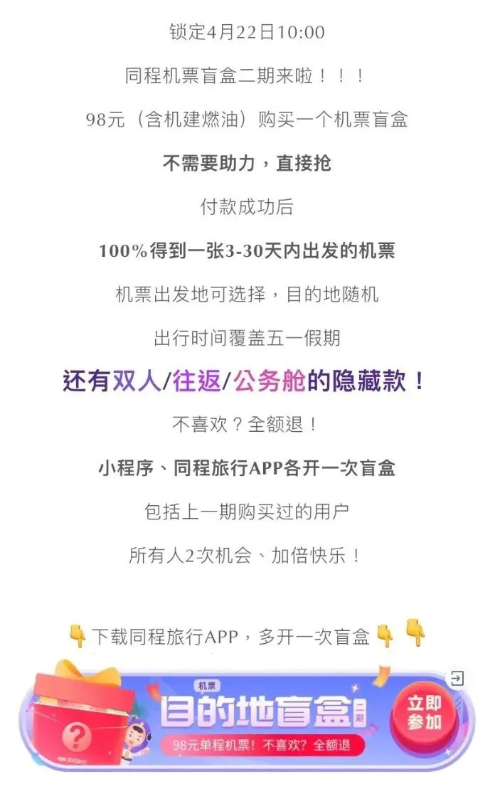 此外,产品的花样也在不断增多。同程在4月22日的第四期机票盲盒中即推出了双人、升舱的隐藏款产品;携程额外推出699元/999元的酒店盲盒;去哪儿网还新增了助力解锁航线活动,每增加三名助力即可多解锁一条航线,最高可解锁十条航线。