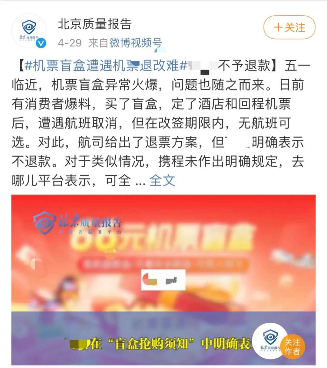 还有部分消费者在退票过程中遇到问题。不少微博用户均表示,自己在某OTA平台上购买的盲盒航班被取消,平台明确表示不予以退款,且非自愿改签仅限原定日期前后三天。