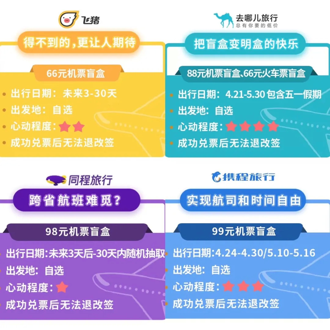 同程的成功点燃了在线旅行(OTA)平台的热情。恰逢五一假期,携程旅行、去哪儿网、飞猪等平台纷纷下场,#机票盲盒#登上微博热搜,抖音相关话题量超3.6亿。