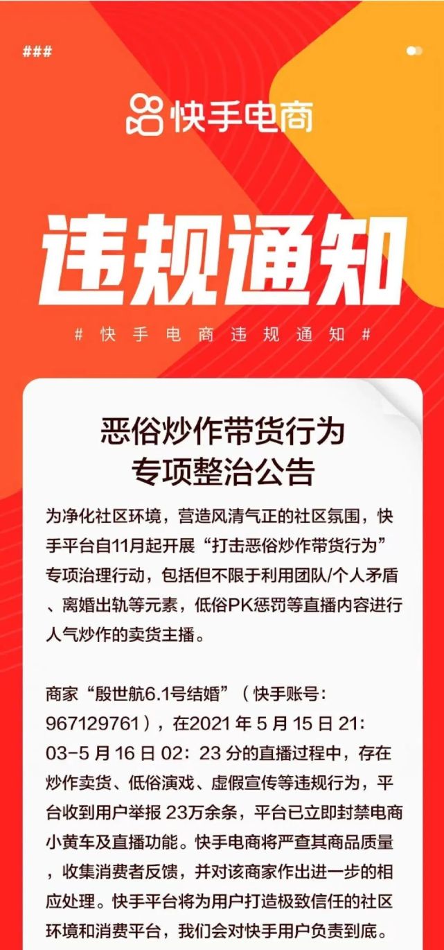 5月17日,快手通过官微发布违规通知:就殷世航炒作卖货、低俗演戏和虚假宣传等违规行为,共计收到了23万多条举报,平台目前已经对其账号进行封禁,并关闭了直播功能。