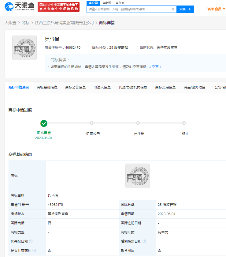 据天眼查APP显示,秦始皇、兵马俑相关商标已被多家公司及自然人申请注册,商标名称包括“秦始皇”“兵马俑”“中国秦始皇专用”“秦始皇长生果”“变形金刚兵马俑”等,国际分类涉及广告销售、啤酒饮料、服装鞋帽、食品等,商标状态多为“等待实质审查”。