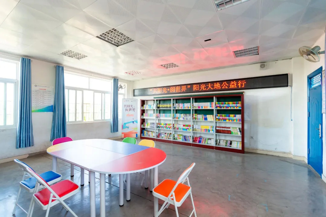 上午10点,捐赠仪式正式开始,阳光大地集团相关负责人以及受赠学校师生代表一同出席,见证了阳光书屋的落成。在新落成的阳光书屋中,数千册图书被分成不同类目排列,色彩鲜艳的阅读桌椅整齐摆放,不仅为孩子们带来了更丰富的精神食粮,也改善了学校的阅读环境。