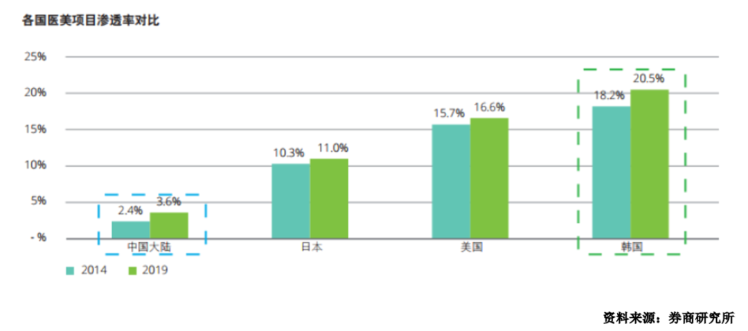 但是基于渗透率情况,我国医美市场仍处于发展初期。根据下图各国医美项目渗透率对比来看,韩国是全球医美渗透率最高的国家,2019年达到了全球最高的20.5%,即5个人之中就有1人接受过医美,这一比率是国内医美渗透率的5-6倍,由此可见国内医美渗透率还有非常大的成长空间,而且从相比渗透率的增速来看,中国增速并不算快,未来也存在出现更高增长的可能性。