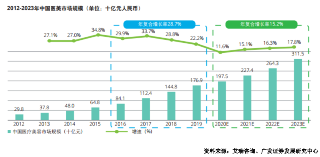 到2019年,国内的医美市场呈现高速增长趋势,年复合增速最高超过30%。据统计,2020年国内医美市场规模达到1975亿元,已经位居全球第一。预测2023年的市场规模将超过3000亿。