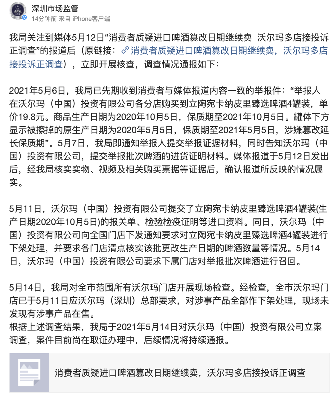 5月19日,深圳市市场监督管理局在其官方微博发布通报称,关注到媒体5月12日“消费者质疑进口啤酒篡改日期继续卖 沃尔玛多店接投诉正调查”的报道后,立即开展核查,调查情况通报如下: