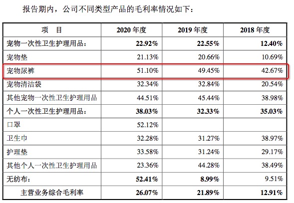 这其中,宠物一次性卫生护理用品销售收入分别为8.15亿元、9.32亿元和10.85亿元。占同期主营业务收入的比例分别为90.31%、90.83%、87.61%。