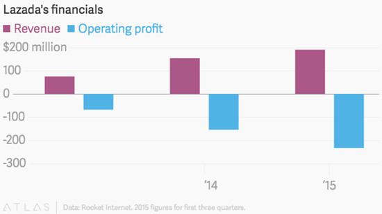 公开数据显示,Lazada在2015年前9个月的销售额为1.91亿美元,损失2.33亿美元。“每一笔交易都在赔钱,”风投公司Ardent Capital CEO Adrian Vanzyl说,“每获得一个用户的平均成本是40到50美元。Lazada做的是赔本的买卖。”