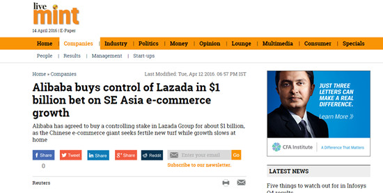 印度媒体Livemint转发了路透社的报道,文中分析了阿里巴巴为什么决定投资东南亚市场。它说,中国市场越来越难做了。在2015年的最后3个月里,阿里平台总交易额增速创三年来最低。而且,这也不是阿里巴巴在东南亚的第一笔投资,之前它还投了物流公司Singapore Post。