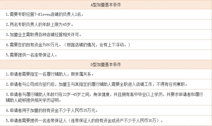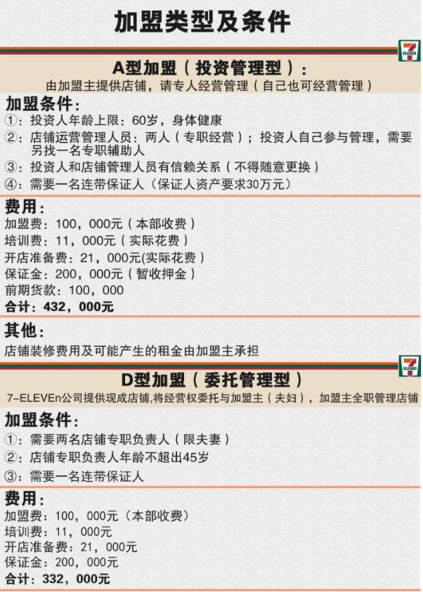 仍然以7-11为例,它的D型加盟被称作委托管理型,选择这种方式的加盟主需要找到一个伙伴共同亲自参与日常经营,前期货款和日常运营产生的费用由总部承担,加盟人以分成方式获利。