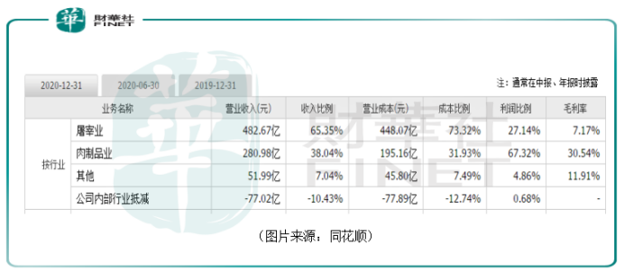 不过,由于两部分业务毛利率之间的巨大差异导致在利润方面,屠宰业务2020年的利润比例仅为27.14%,而肉制品业务的利润比例则达到了67.32%。