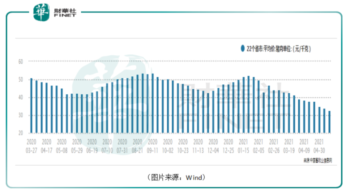 值得注意的是,非洲猪瘟带来的超级上行周期也在2021年一季度开始了持续不断的降温。Wind数据显示,猪肉平均价已经由一月中旬超过50元/千克回落到了现在的30多元/千克,以至于众多网友纷纷高呼,“终于可以敞开吃肉了”。