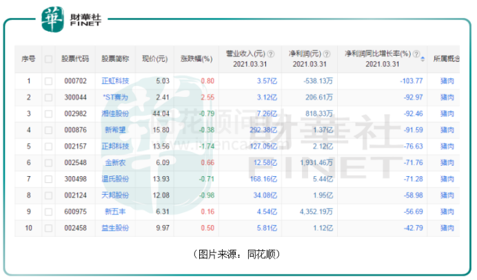 今年一季度,处于上游的生猪养殖企业除了牧原股份等极少数公司外,其余大多都经历了业绩的下滑。例如,正邦科技的净利润同比下滑76.63%至2.12亿元。