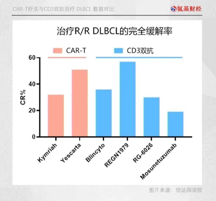 当前,在血液瘤治疗领域,双抗展现出不输CAR-T疗法的架势。Kymriah、Yescarta两款CAR-T疗法,与一些CD3双抗的药物对比,在治疗复发/难治性弥漫大B淋巴瘤时,所达到的完全缓解率似乎没有太大差别。