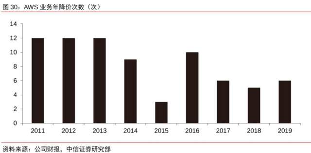另外,全球云计算厂商都在进行一场价格战的比拼。以巨头亚马逊AWS为例,亚马逊AWS曾连续三年每年降价12次,现在也有一年6次降价。