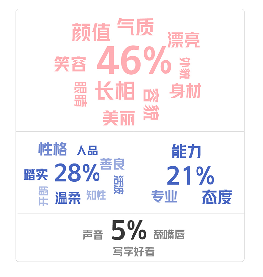 此外,职场人对于另一半的心动因素也有所不同,但总体而言,颜值占据较大比例。数据显示,近半数职场人笃定“颜值即正义”,也有21%的职场人心动源于认真工作的样子,而性格相关因素与工作相关因素也不分伯仲,占比达28%。