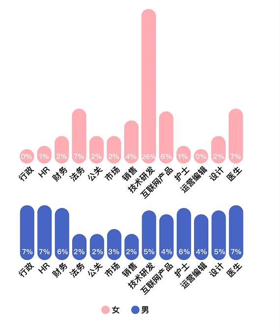 报告显示,在互联网行业里,技术研发、产品运营、行政、销售岗位的职场人都把理想伴侣的选票都给了同行,而HR、法务、市场则纷纷跑票,设计则普遍没有职位偏好。另从性别来看,相比男性,女性偏爱程序员,而男性则没有偏好,在男性互联网人的心中,不同岗位的小姐姐各有各的好。