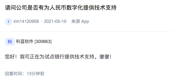 科蓝软件20日在互动易上表示,公司正在为试点银行提供技术支持。