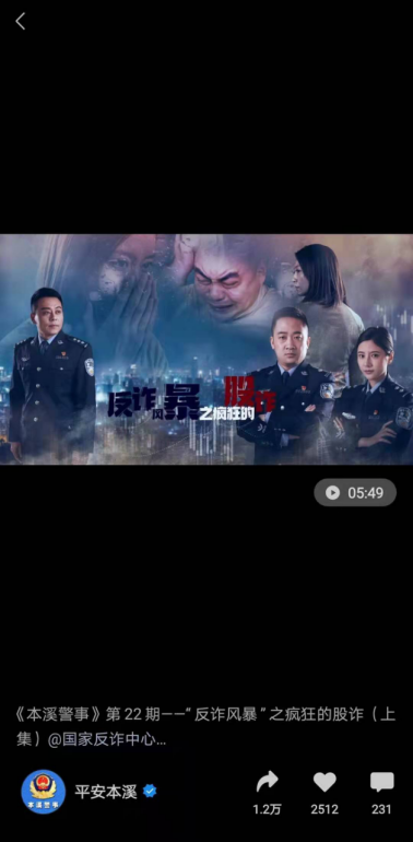 辽宁本溪市公安局视频号@平安本溪更是将反诈宣传进行得如火如荼,公安干警直接飙演技,出了《本溪警事》视频连载,聚焦校园反诈、股诈、骗术起底等等,画风感受一下↓