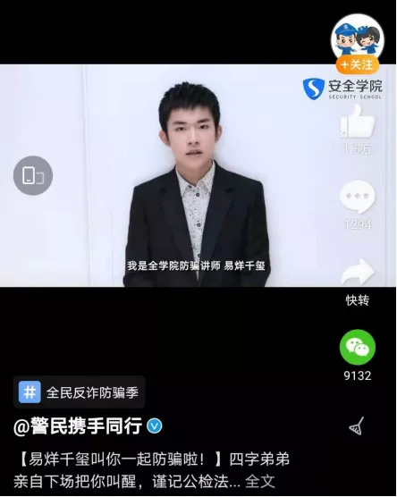 前段时间,公安部还联合支付宝安全中心在微博发起了全民反诈公益项目--安全学院,由易烊千玺担任安全讲师↓