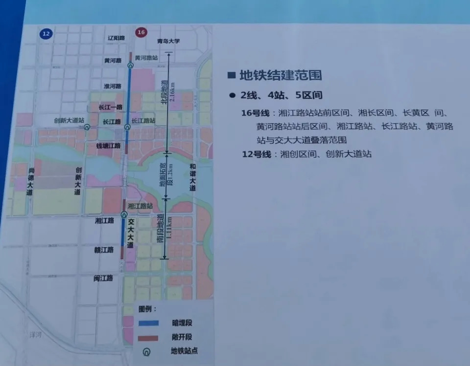 青岛地铁16号线或沿着上合示范区的交大大道往双积公路方向铺设,经过湘江路站站前区间、湘长区间、长黄区间、黄河路站站后区间、湘江路站、长江路站、黄河路站与交大大道叠落,并在上合示范区(湘江路)与12号线相连。