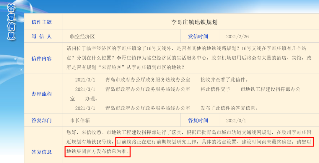 青岛地铁16号线方面,2020年3月1日,青岛市地铁办方面表示,地铁16号线目前还在规划当中,具体的路由走向尚未最终确定,具体的线路走向以市地铁办最终公示路线为准。