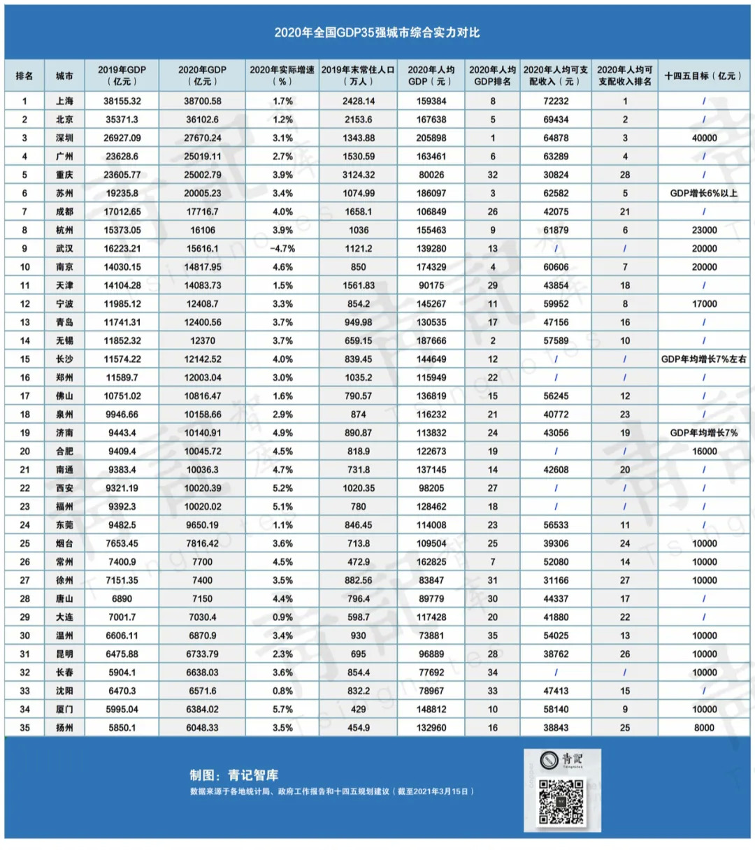 2020年,在全国GDP前35强城市中,成都GDP排名第7,但人均GDP排名第26,人均可支配收入排第21。