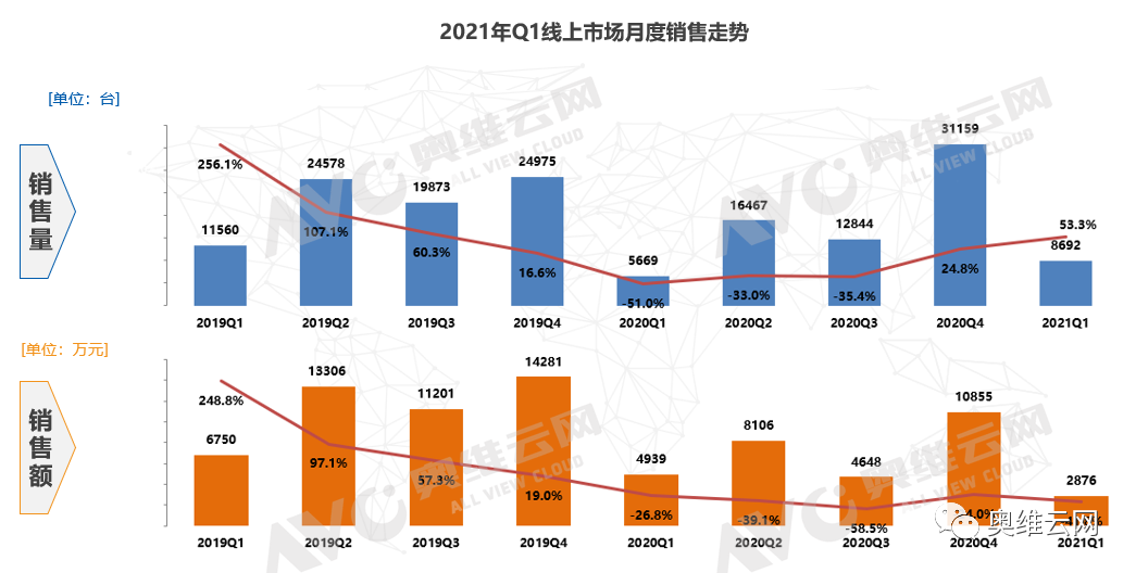 在线上零售市场,新风系统需求逐渐回暖。据奥维云网(AVC)地产罗盘3.0显示:2021年一季度销量同比增长53.3%,相较于去年同期,今年销售量不但呈增速翻倍高增,而且其销量超过去年同期销量的1.5倍还有余。分析认为,在疫情防控常态化下,人们对健康的意识不断增强,新风市场需求正在不断释放。