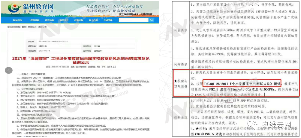 除住宅工程市场外,校园新风也为行业注入新的活力。源引自《“温馨教室”工程温州市教育局直属学校教室新风系统采购需求意见》(2021年5月19日)的文件中,要求:室内新风口宜设置2-3个,排风口1-2个,科学合理,整体美观。同时在抗菌与空气质量中要求:1.新风机具备自身净化消毒杀菌模块,安环环保,使用中无臭氧释放。2.按照T/CAQ1 26-2017《中小学教室空气测试方法》测试,教室空气质量要满足PM2.5<=35Ug/立方米、CO2浓度<=1000PPm,并且提供相应的国家机构出具的检测报告”。