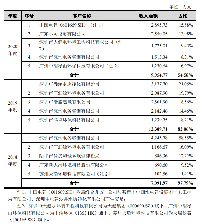 清研环境对此解释称,系因为2018年公司收入规模较小、且当时深水咨询投资建设的观澜河口调蓄池提标项目规模较大,因此导致当期单个客户收入占比较大。