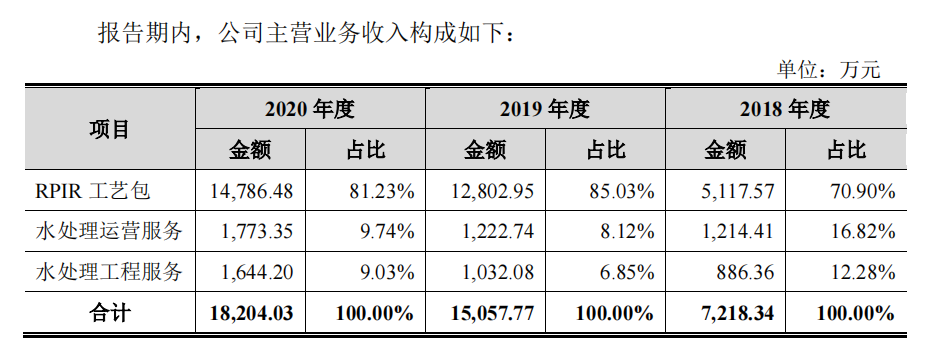 报告期内,清研环境的主营业务收入来源于RPIR工艺包销售、水处理运营服务及水处理工程服务三项收入,其中,RPIR工艺包实现销售收入分别为5117.57万元、1.28亿元和1.48亿元,占主营业务收入的比重约在70%以上,是公司主营业务收入的主要来源。