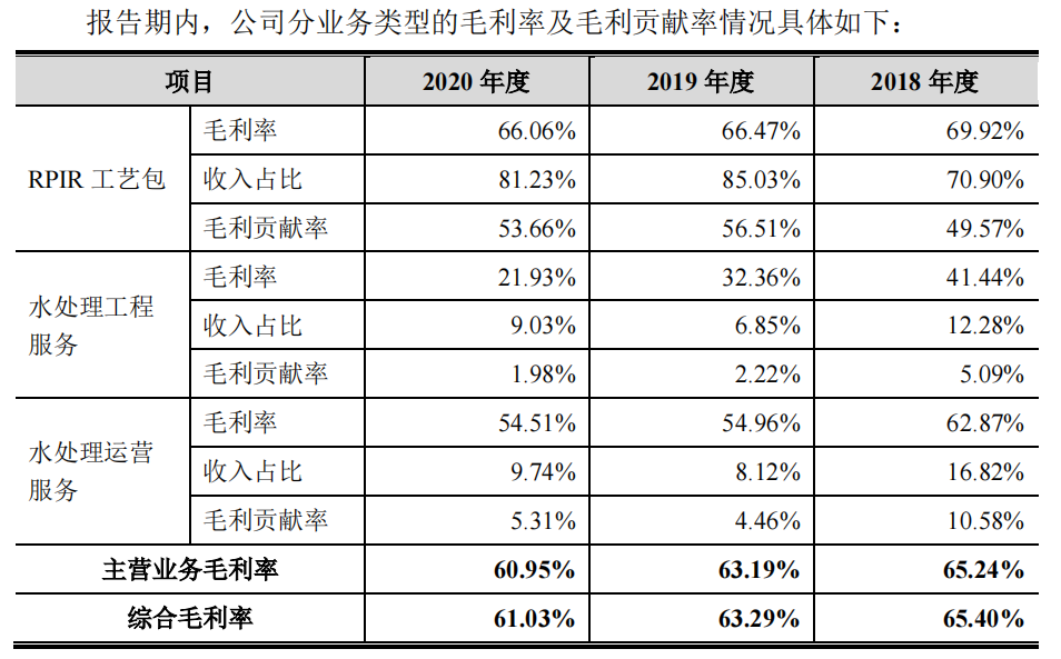 其中,清研环境RPIR工艺包销售毛利率分别为69.92%、66.47%和66.06%,基本保持稳定,贡献率分别为49.57%、56.51%和53.66%,是影响公司主营业务毛利率水平的主要因素。