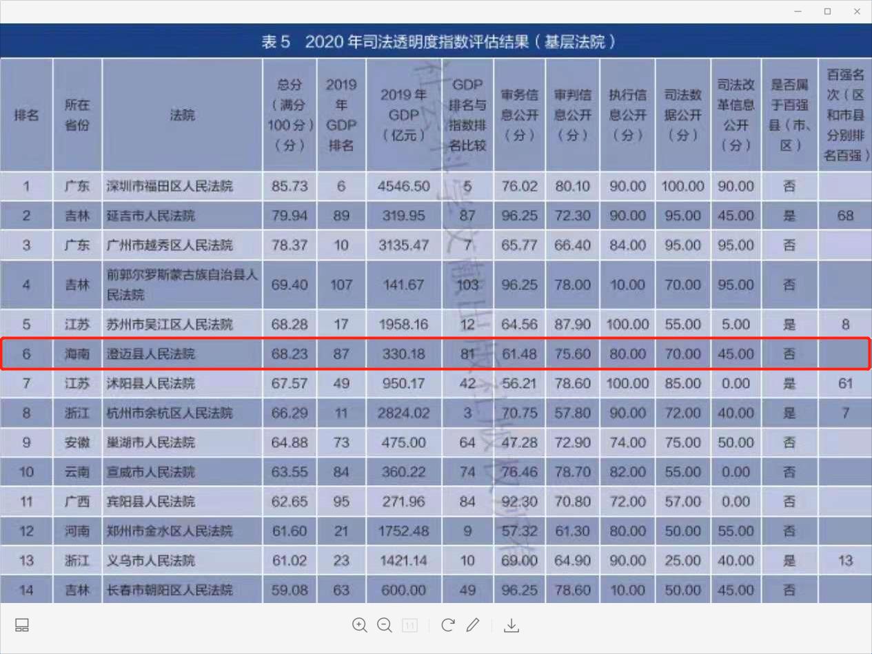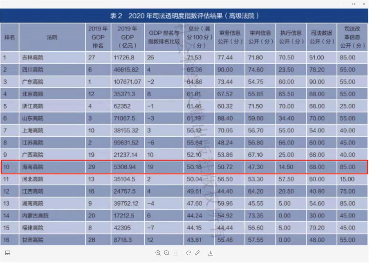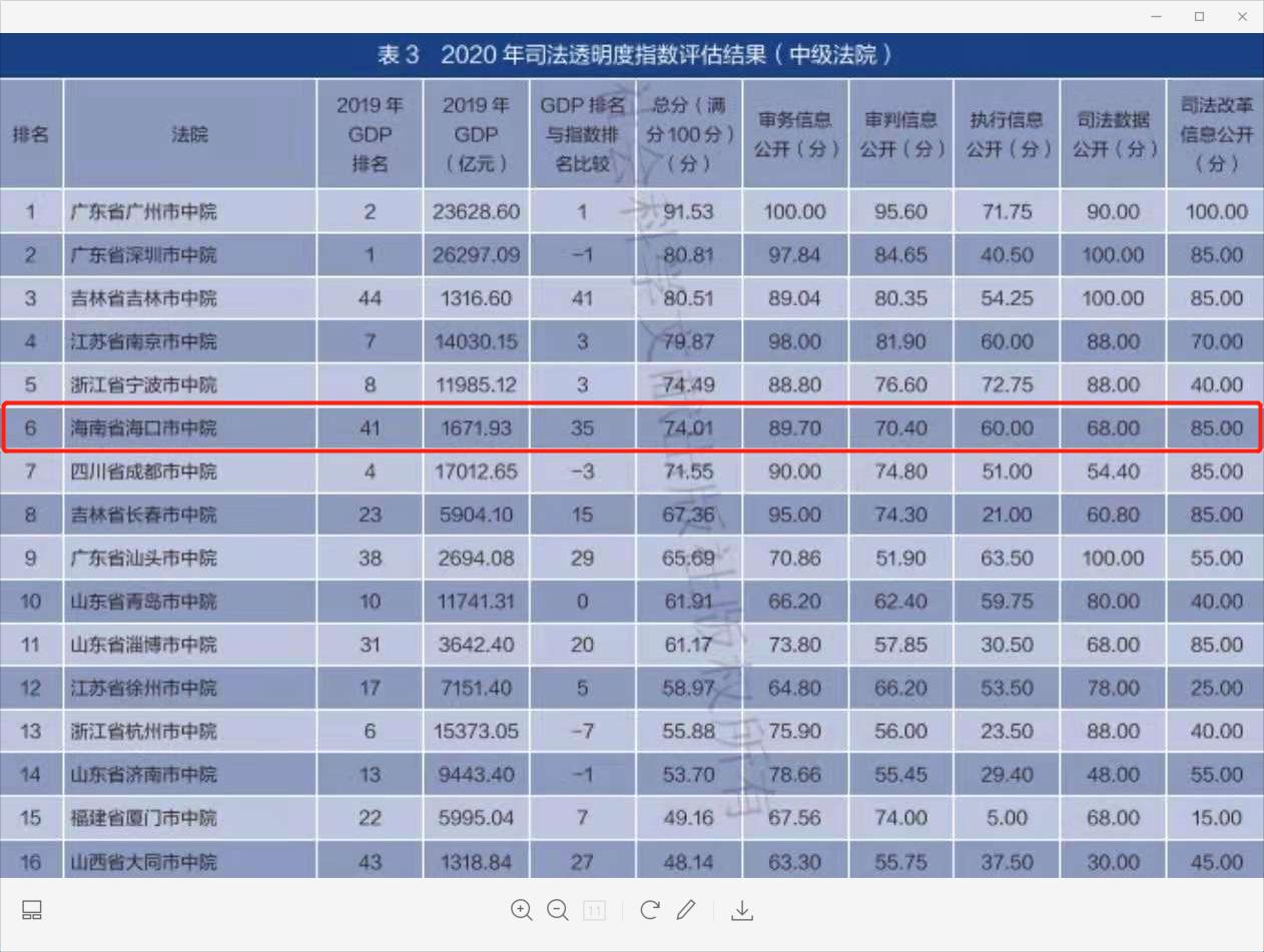 5月19日,中国社会科学院法学研究所、社会科学文献出版社在北京联合发布了《中国法治发展报告NO.19(2021)》和《中国司法透明度指数报告(2020)》。评估结果显示,海南高院、海口中院、澄迈县法院分别在同级法院中位列第十名、第六名、第六名。这是2011年开展司法透明度第三方评估以来,海南法院连续十年在全国法院司法透明度指数评估中取得佳绩。