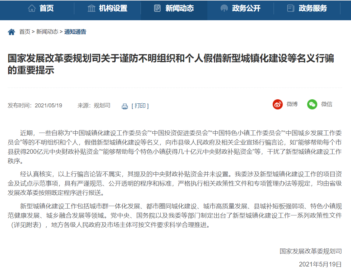 据国家发改委网站5月19日消息,近期,一些自称为“中国城镇化建设工作委员会”“中国投资促进委员会”“中国特色小镇工作委员会”“中国城乡发展工作委员会”等的不明组织和个人,假借新型城镇化建设等名义,向市县级人民政府及相关企业宣扬行骗言论,如“能够帮助每个市县获得200亿元中央财政补贴资金”“能够帮助每个特色小镇获得几十亿元中央财政补贴资金”等,干扰了新型城镇化建设工作秩序。