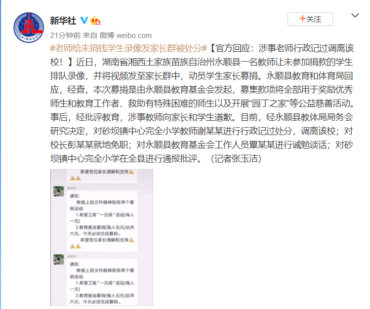 据新华社5月20日消息,近日,湖南省湘西土家族苗族自治州永顺县一名教师让未参加捐款的学生排队录像,并将视频发至家长群中,动员学生家长募捐。永顺县教育和体育局回应,经查,本次募捐是由永顺县教育基金会发起,募集款项将全部用于奖励优秀师生和教育工作者、救助有特殊困难的师生以及开展“园丁之家”等公益慈善活动。事后,经批评教育,涉事教师向家长和学生道歉。