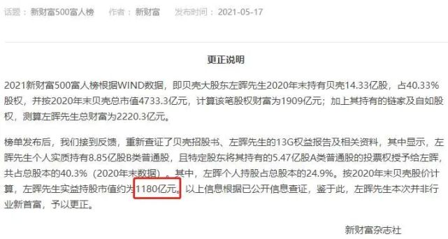 不过5月17日,新财富发出更正声明,称左晖个人持有贝壳总股本的24.9%,按2020年末贝壳股价计算,这部分持股市值约为1180亿元。如果再加上其持有的链家及自如股权311亿元,那左晖的真实身家应该为1491亿元,排500富人榜第19位,位于牧原股份秦林英家族之后,低于碧桂园的杨惠妍。
