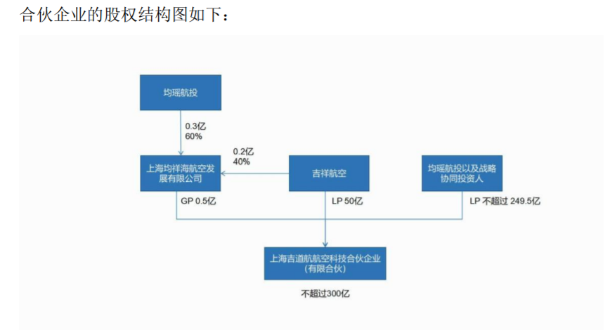 公告显示,该合伙企业名称暂定为上海吉道航航空科技合伙企业,吉道航全体合伙人出资总额不超过300亿元人民币,其中,吉祥航空作为有限合伙人出资额为50亿元,均瑶航投以及战略协同投资人合计出资金额不超过249.5亿元,剩余的0.5亿元人民币,由吉祥航空和均瑶航投共同设立的上海均祥海航空发展有限公司进行出资,该公司属于普通合伙人。